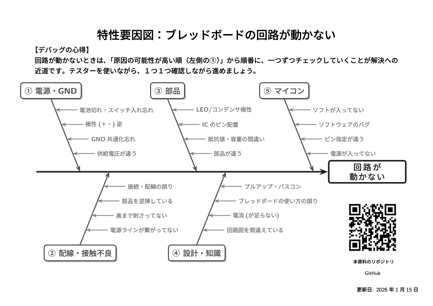超基本的な内容を知ることを抑え、電子回路を組み立てる最中に不具合を見つけやすくすることで、回路を作る練習をサポートすることです。